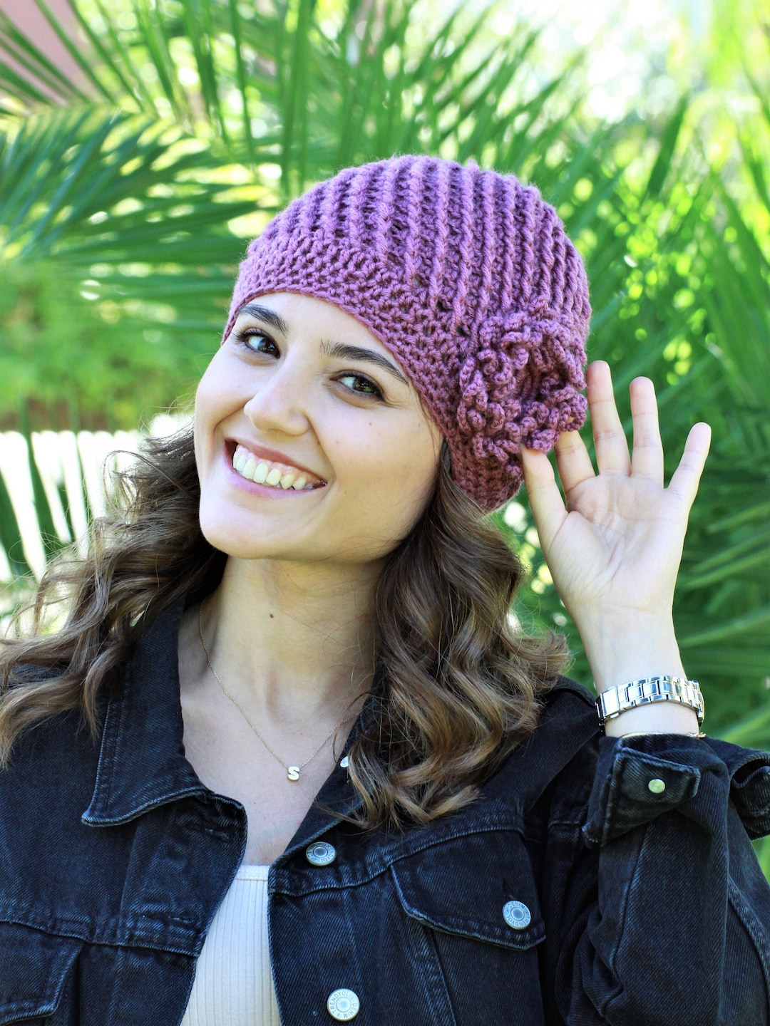 Handmade Crochet Beanie With Flower Women Skull Cap In Dry Etsy
